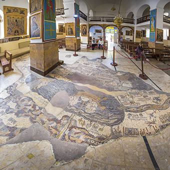 The Madaba mosaic map located in the Greek Orthodox Church is the oldest picture map of the entirety of the Holy Land that mentions the names of historical cities and rivers. The map is said to have been made during the second half of the sixth century due to its stylistic resemblance to that of the Church of the Apostles.